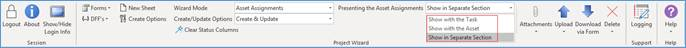 To view the Asset Assignments options, you will need to select ‘Asset Assignments’ from the ‘Wizard Mode’ list of values provided on the Project Wizard ribbon as per the screenshot below: