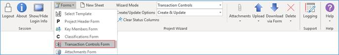 To enter Transaction Control details, double click in the ‘Transaction Controls’ section of the worksheet below row 9 or click the ‘Forms’ icon and select ‘Transaction Controls Form’ from the Project Wizard ribbon: